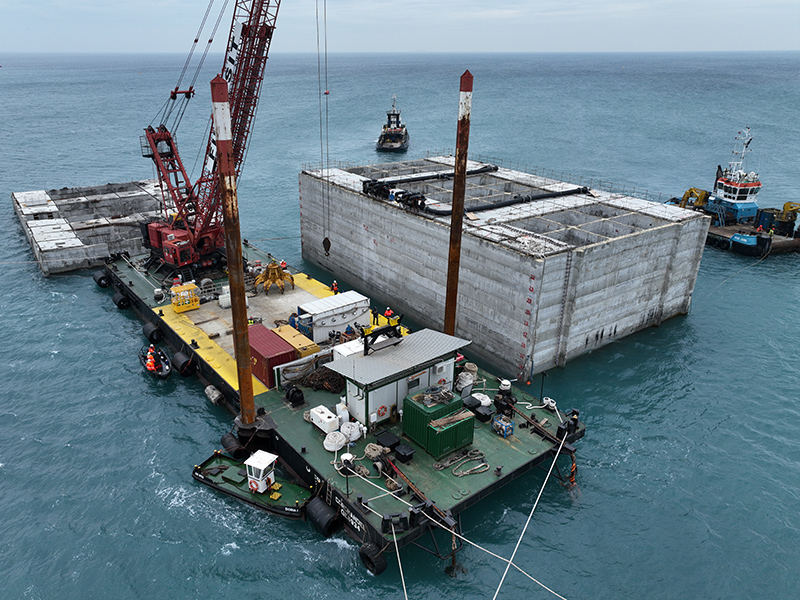Realizzati in cemento armato, sono veri e propri giganti: grossi come palazzi, vengono posati uno accanto all’altro sul basamento sommerso per dare forma alla diga.
